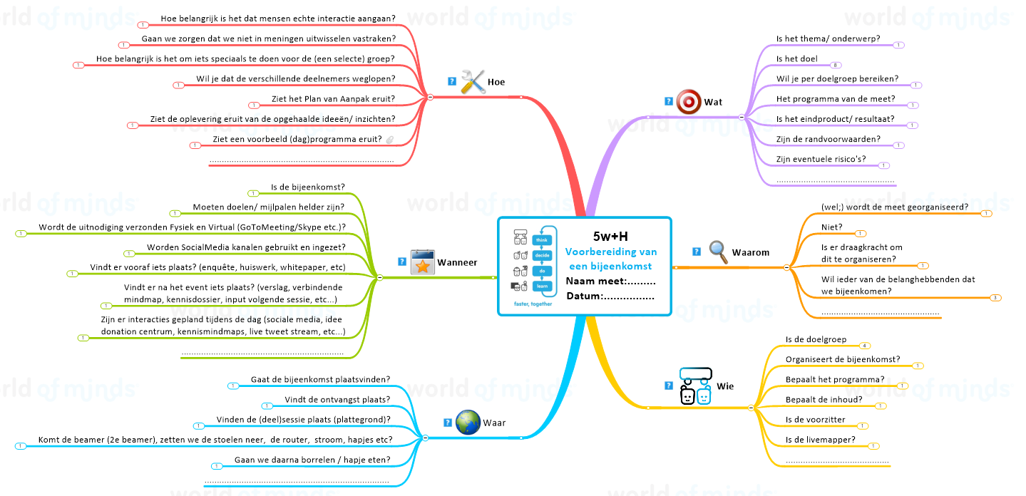 Voor het ontwerp van de sessie is gebruik gemaakt van de 5W+H template van World of Minds die voor elk type sessie kan worden gebruikt. Daar de kennis en ervaring van niet alleen World of Minds in de template is opgenomen maar ook die van al haar klanten is de kans op succes groter. Na elke sessie wordt immers samen met de opdrachtgever geëvalueerd en worden verbeterpunten in de templates verwerkt.