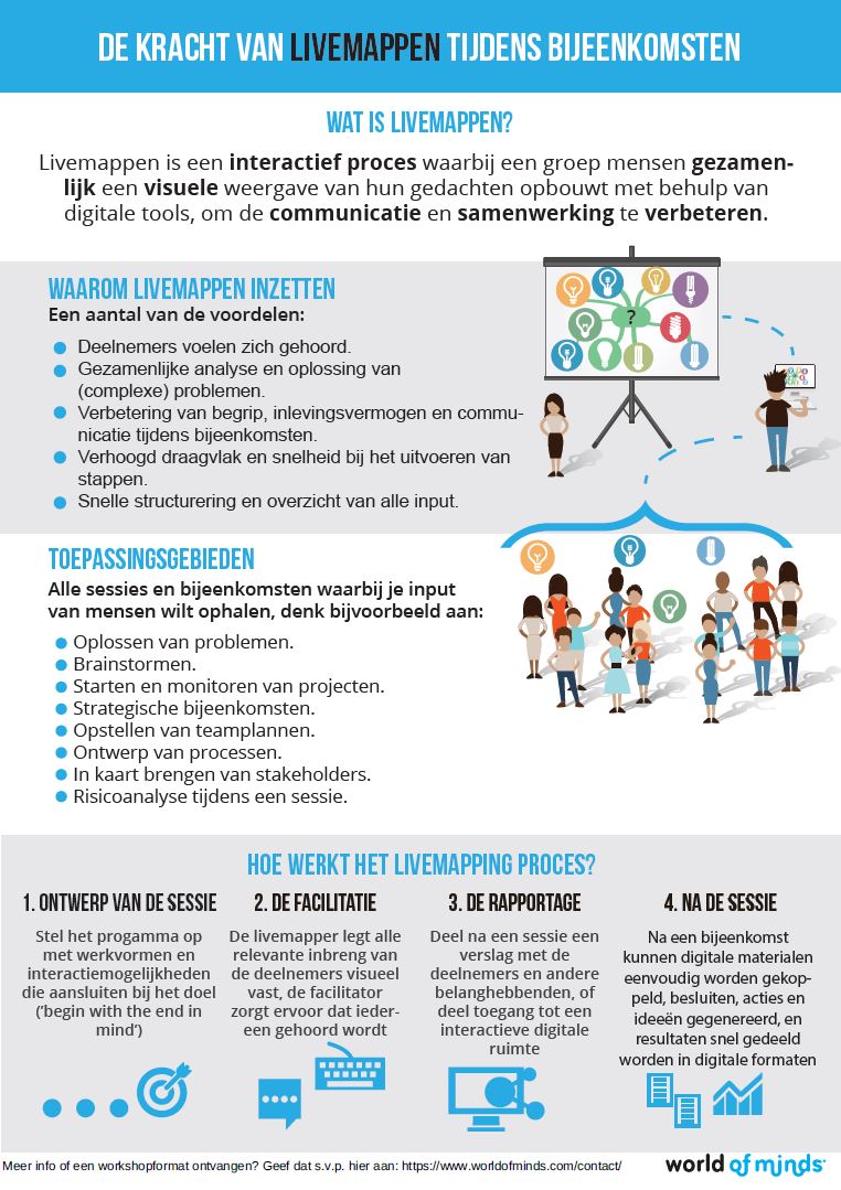 Tijdens vergaderingen, grotere sessies of gesprekken in klein verband kan het een uitdaging zijn om je te blijven concentreren, de rode draad vast te houden, je verhaal of ideeën kwijt te kunnen, het overzicht te behouden en niet uit te tijd te lopen. Herkenbaar? Livemappen, ook wel Live Digital Mapping (LDM) genoemd, is een innovatieve veelzijdige methode om het uitwisselen van gedachten tijdens een bijeenkomst te faciliteren.