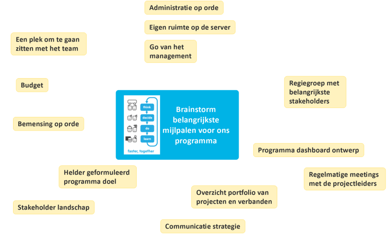 - Gebruik een mindmap als graphical format om informatie op te halen en te structureren. Plaats het doel duidelijk in het midden om deelnemers op het goede spoor te houden.