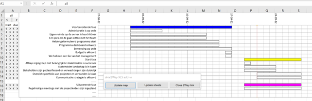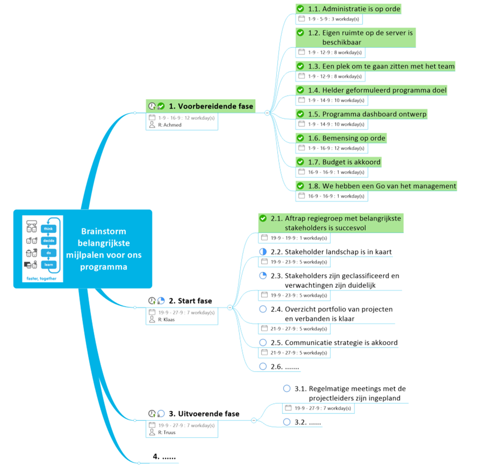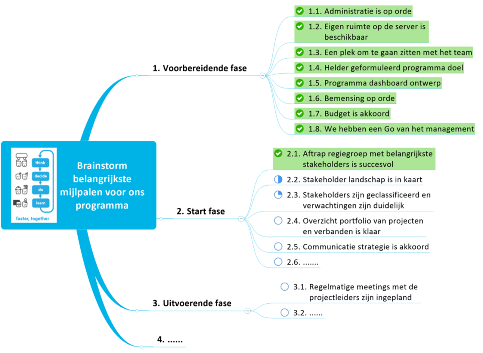 Voorbeeld van het Livemappen tijdens een brainstorm om te komen tot de mijlpalen van een programma