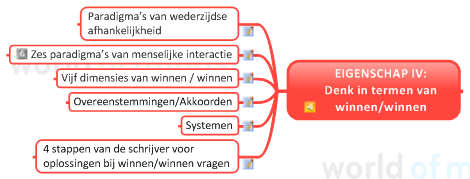 Paradigma’s van wederzijdse afhankelijkheid Zes paradigma’s van menselijke interactie Vijf dimensies van winnen / winnen Overeenstemmingen/Akkoorden Systemen 4 stappen van de schrijver voor oplossingen bij winnen/winnen vragen