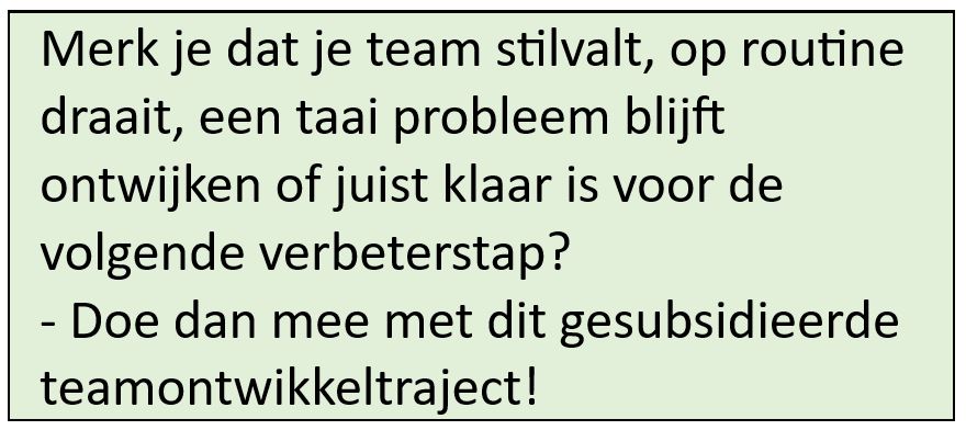 Regiegroep: Samenstelling van 2–3 mensen van jullie team + 1 WoM-adviseur voor korte lijntjes, monitoring en besluitkracht. Teamontwikkeling is een continu verbeterproces en vraagt meer dan ‘projectleiding’.